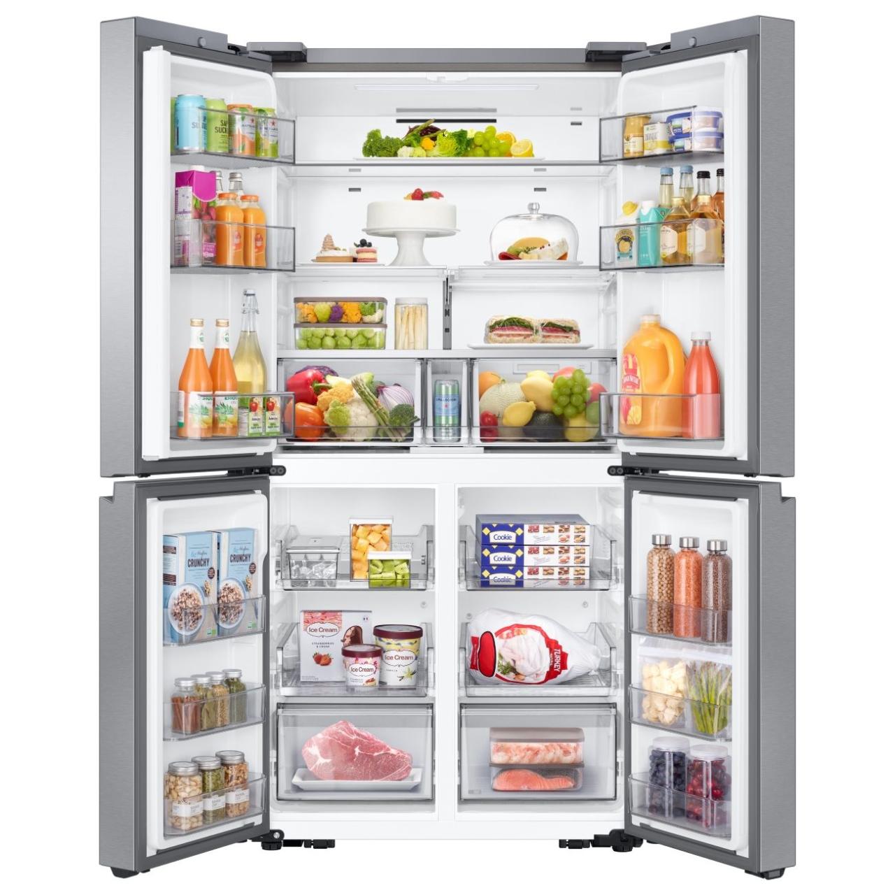 Технология No Frost применяется в обеих камерах, предотвращая образование инея и наледи. Управление осуществляется как электронной панелью, так и дистанционно через приложение SmartThings с поддержкой Wi-Fi.