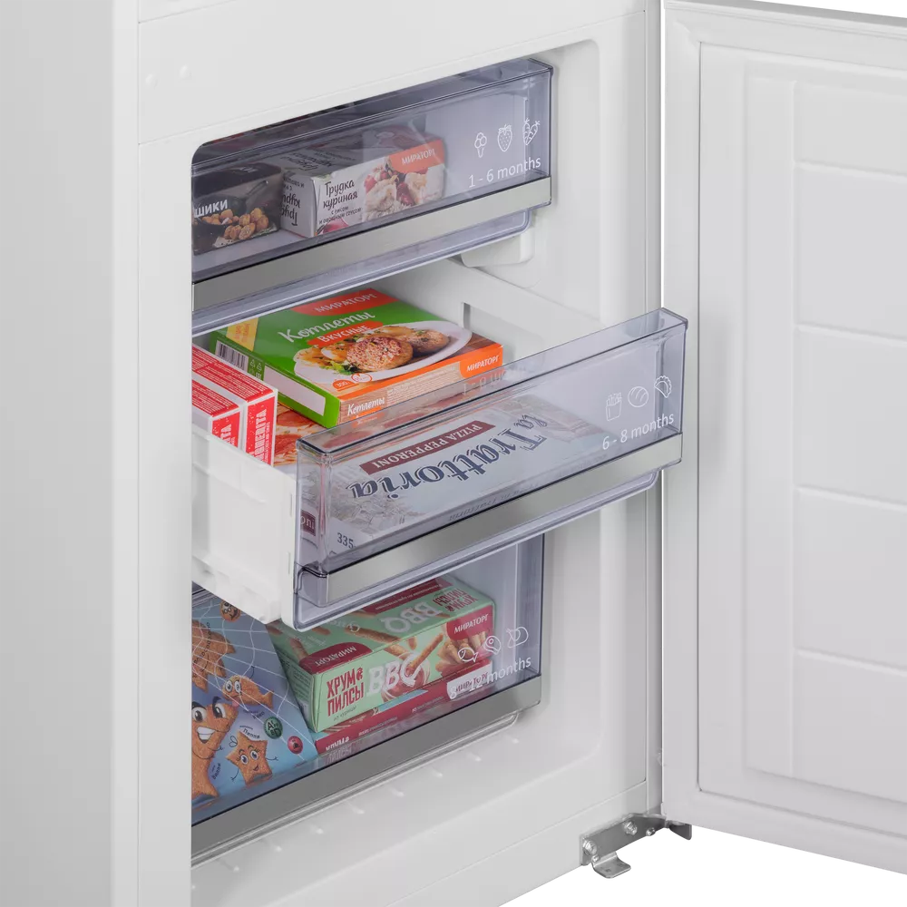 Встраиваемый холодильник с инвертором MAUNFELD MBF177SWGR Inverter — практичное решение для аккуратной интеграции техники в кухонный гарнитур и комфортного повседневного использования. Модель легко вписывается в высокий шкаф и помогает поддерживать порядок внутри камер.