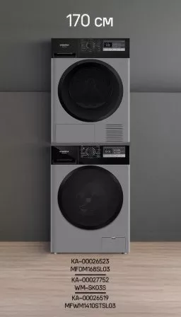 Комплект Maunfeld сочетает стиральную машину MFWM1410STSL03, сушильную машину MFDM168SL03 и соединительный элемент WM-SK03S. Решение для полного цикла ухода за бельём и компактного размещения в формате колонны.
