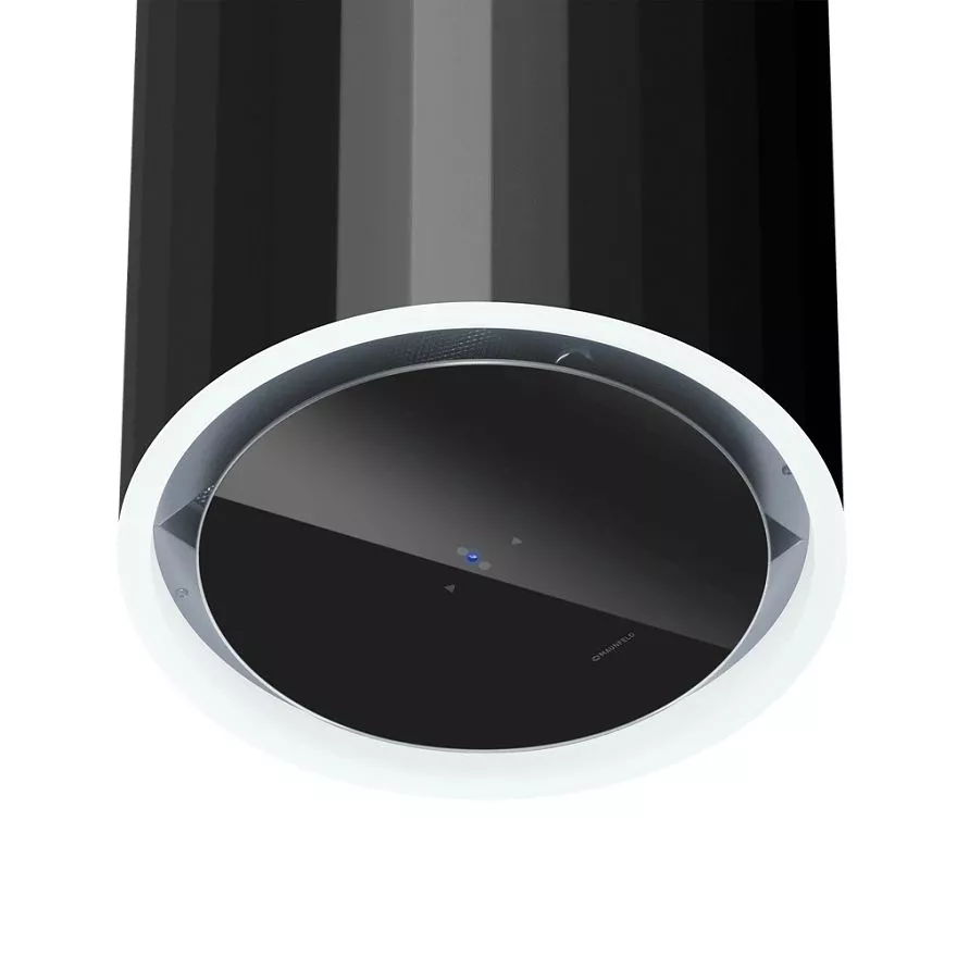Дизайн вытяжки эффектно выделяется рельефными полосами вдоль цилиндрического корпуса и запоминающейся стеклянной панелью, выполненной в соответствии со всеми тенденциями рынка бытовой техники.