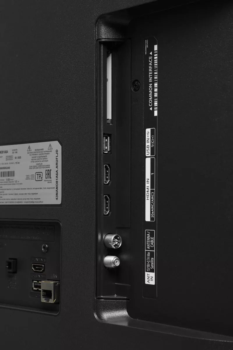 Подключения: 3× HDMI (с поддержкой eARC), 2× USB 2.0 Type-A, Ethernet (RJ-45), оптический выход (S/PDIF), CI+/PCMCIA, два антенных входа (DVB-T2/C/S2).