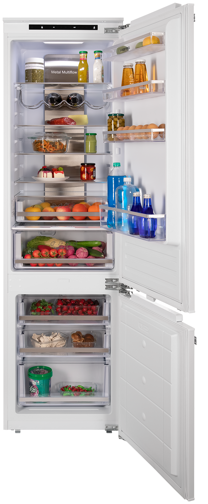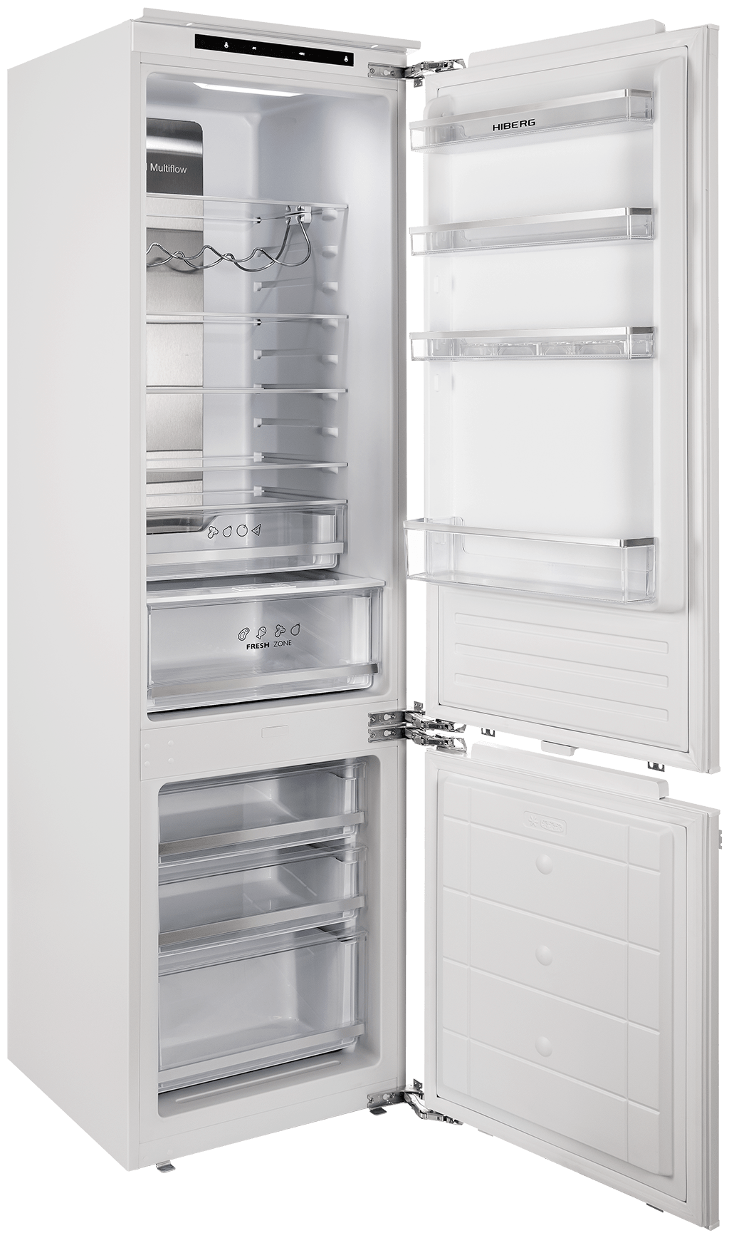 Встраиваемый холодильник HIBERG RFCB-455 F NFW с общим объемом 307 л идеально впишется в кухонный гарнитур, буквально «сливаясь» с ним, а возможность перенавешивания двери создает удобство открывания с нужной стороны.