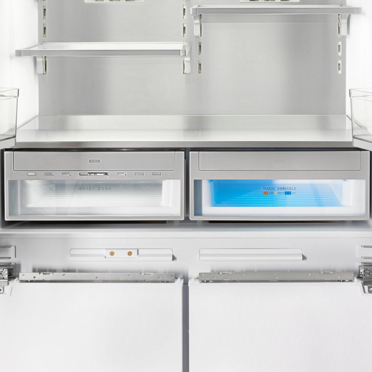 Благодаря четырехдверной конструкции и открыванию дверь в дверь пользователь получает доступ к продуктам, не выпуская при этом холод из остальной части холодильника. Модель имеет жесткую систему крепления фасадов: они не связаны с корпусом шкафа, не предполагают наличие дополнительных петель. Холодильник имеет неограниченный угол открывания, отсутствуют зазоры, в которых могут скапливаться загрязнения.